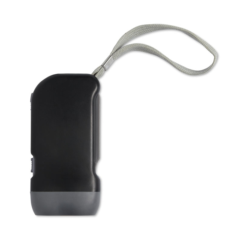 Compacte dynamo zaklamp met 2 LED-lichtjes, gemaakt van stevig ABS en geleverd inclusief batterijen. Ideaal voor dagelijks gebruik en promotionele doeleinden.